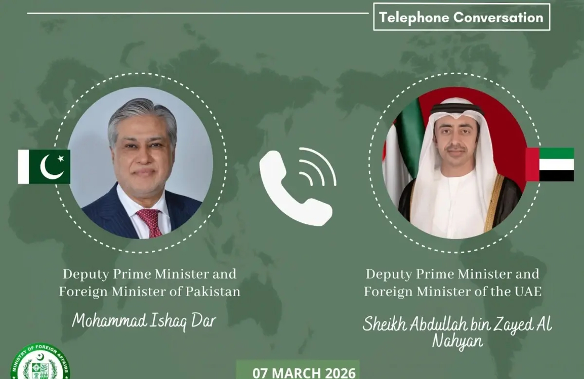 اسلام آباد:نائب وزیراعظم و وزیر خارجہ سینیٹر اسحاق ڈار نے متحدہ عرب امارات کے نائب وزیراعظم و وزیر خارجہ شیخ عبداللہ بن زاید سے ٹیلیفونک رابطہ کیا۔