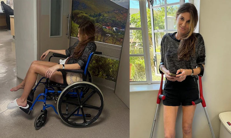 ذرائع کے مطابق جمائما گولڈ اسمتھ ہائیکنگ کے دوران گر کر زخمی ہوئیں۔ تازہ جاری کردہ تصاویر میں انہیں وہیل چیئر پر اور بیساکھیوں کے ساتھ دیکھا جاسکتا ہے۔