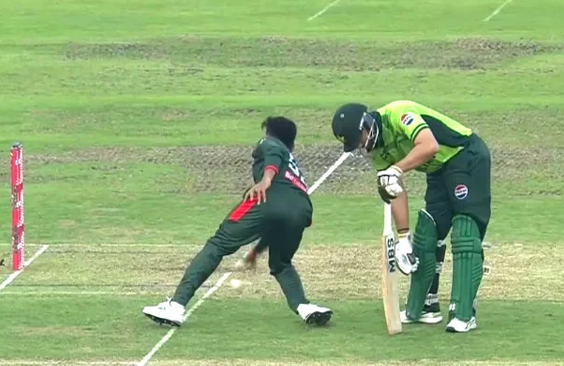 بنگلادیشی کپتان مہدی حسن میراز اسپورٹس مین اسپرٹ بھول گئے۔ مہدی حسن کی گیند پر محمد رضوان نے سامنے شاٹ کھیلا۔ گیند بولر کے پاؤں سے ٹکرائی۔