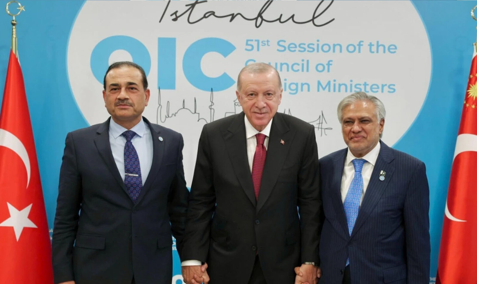 استنبول :نائب وزیر اعظم و وزیر خارجہ سینیٹر محمد اسحاق ڈار نے اسلامی تعاون تنظیم کے وزرائے خارجہ کونسل کے 51ویں اجلاس کے موقع پر ترک صدر رجب طیب اردوان سے ملاقات کی اس موقع پر پاکستان کے چیف آف آرمی اسٹاف فیلڈ مارشل سید عاصم منیر بھی ان کے ہمراہ تھے۔