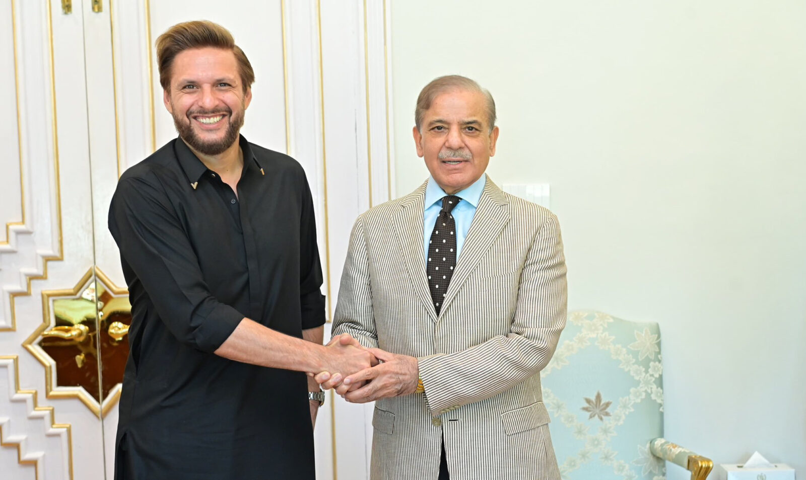 وزیراعظم شہباز شریف نے اس موقع پر پاکستان کے اسٹار کرکٹر شاہد آفریدی کو شیلڈ بھی پیش کی، ملاقات کے موقع پر وفاقی وزیر اطلاعات عطا تارڑ بھی موجود تھے۔