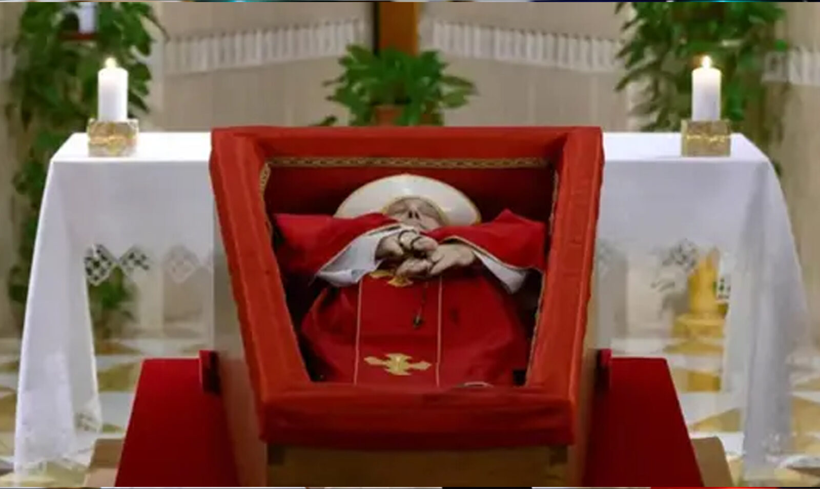 غیر ملکی میڈیا رپورٹس کے مطابق ویٹیکن نے کھلے تابوت میں موجود پوپ فرانسس کی تازہ ترین تصاویر جاری کی ہیں جس میں انہیں سرخ لباس میں ملبوس دیکھا جاسکتا ہے، تصاویر میں ان کے سر پر پوپ میٹر اور ہاتھ میں مخصوص مالا ہے۔